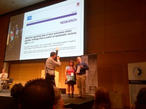 Primary Investigator, Dr Jamie Kirkham receiving the Bill Silverman Award at the Cochrane Colloquium, Vienna 2015 for the research article entitled “Selective reporting bias of harm outcomes within studies: findings from a cohort of systematic reviews"